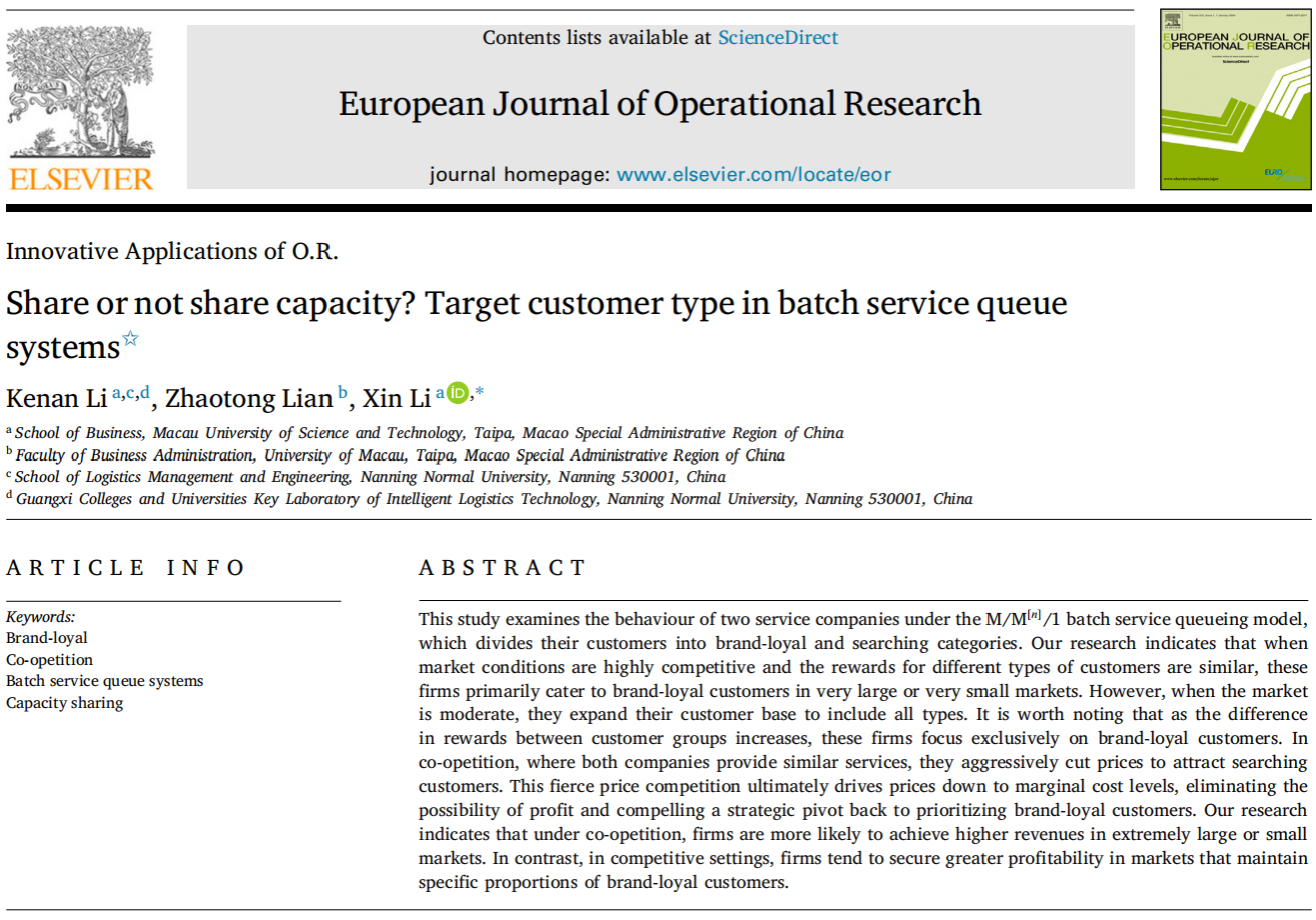 青年教师李柯南博士在运筹学领域国际权威期刊《European Journal of Operational Research》上发表题为“Share or not share capacity? Target customer type in batch service queue systems”的学术论文。《European Journal of Operational Research》是欧洲运筹学会联合会会刊,英国商学院协会(Association of Business Schools, ABS)认定的四星级期刊、中国《FMS管理科学高质量国际期刊推荐列表》中的A类期刊,JCR SCI一区期刊,是运筹学领域国际公认的顶级期刊。该论文由李柯南博士(色情漫画-同性色情漫画