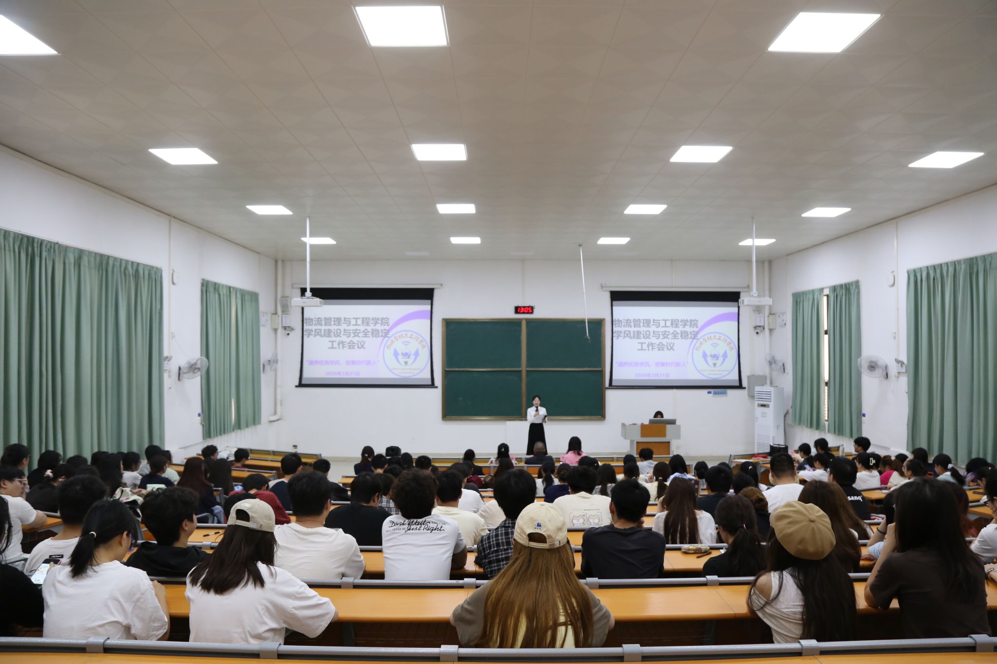 会议过程中,黄宇副书记首先发言。他强调,学风是学院之魂,安全是发展底线。结合高年级学生求职焦虑的实际情况,他提醒同学们摒弃“上大学就可以放松”的错误观念,珍惜宝贵的学习时光。针对旷课、早退、晚归等问题,学院将从严管理,并要求学生干部切实扛起责任。紧接着,会议对获评“六项文明班级”的集体进行了表彰,并号召各班级向先进看齐。学院学生会主席李冠青详细解读了六项文明评比细则,明确了考勤、升旗、自习、宿舍等方面的检查标准及加减分规则,同时通报了近期旷课情况与纪律处分规定,提醒全体同学严格遵守校纪校规。在安全方面,周佳老师就校园安全工作作出部署,重点提醒同学们注意宿舍用电安全、晚归未归、出行安全及防范网络诈骗,要求全体同学严守纪律、珍爱生命,共同维护安全有序的校园环境。会议最后,黄海嫚老师聚焦大学生创业大赛,鼓励同学们将专业知识转化为实践能力,积极投身创新创业竞赛,在挑战中明确方向、锻炼自我。