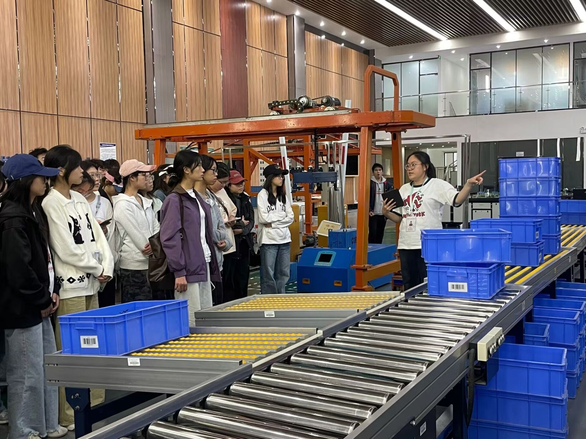 在智能分拣实验区域,学院学生会执行主席李冠青与团委秘书长林怡冰担任现场讲解,系统演示了自动化分拣系统的工作流程与控制逻辑。从条码扫描识别、路径规划到高速分拣推送,整个流程高效精准,展现出智慧物流系统的技术核心。讲解内容不仅涵盖设备原理,更延伸至电商仓储、跨境物流等实际应用场景,并介绍了该平台在支撑学科竞赛中的重要作用,体现出学院在教学、科研与产业融合方面的扎实基础。